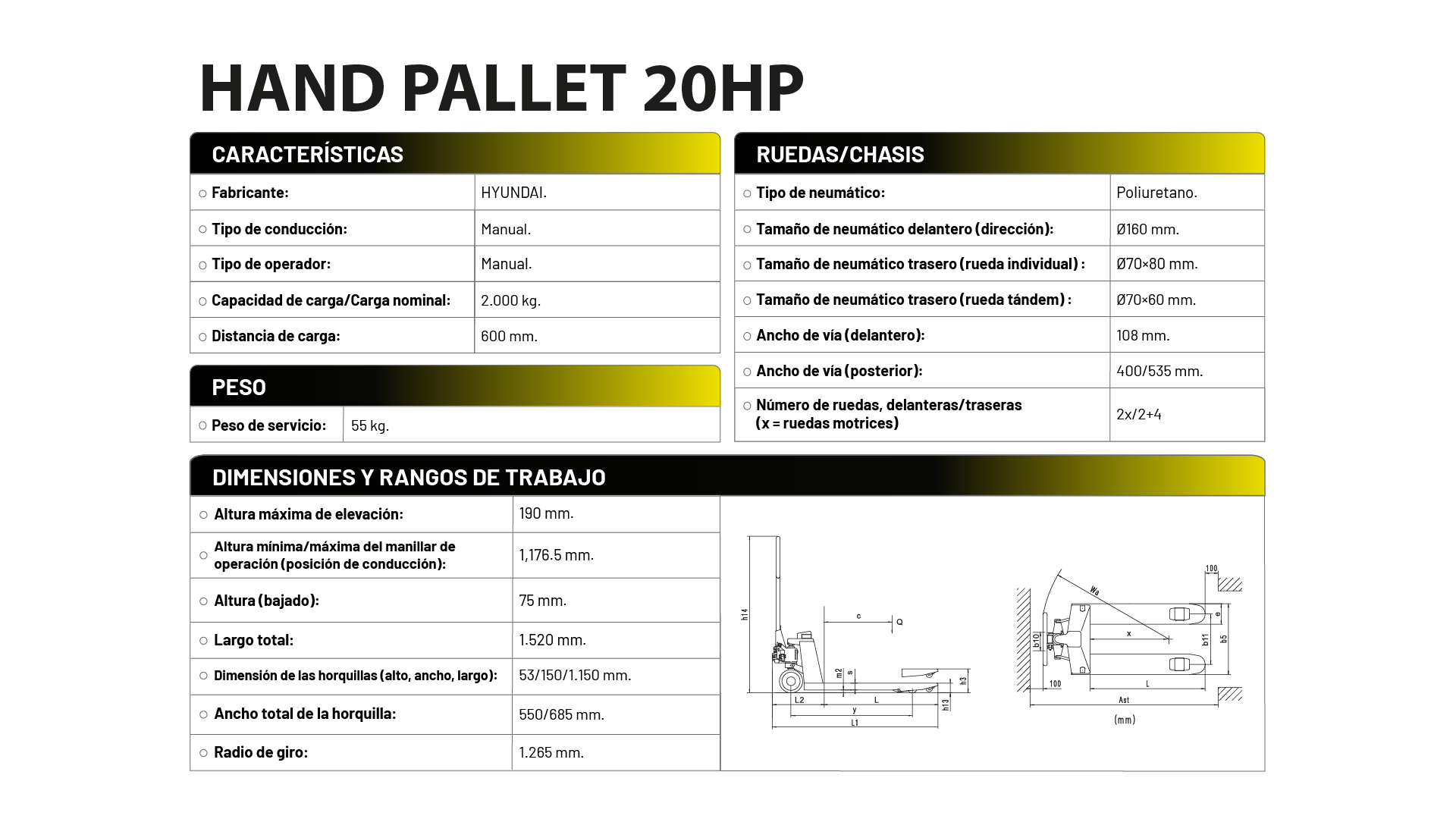 Eficiencia y maniobrabilidad en espacios reducidos. El Hand Pallet 20HP ofrece una capacidad de carga de 2.000 kg y una construcción robusta, ideal para operaciones logísticas exigentes. Su sistema manual y ruedas de poliuretano aseguran desplazamientos suaves y seguros en superficies delicadas. Compacto y ligero (55 kg), es perfecto para tareas de carga rápida, optimizando tiempos sin sacrificar resistencia.