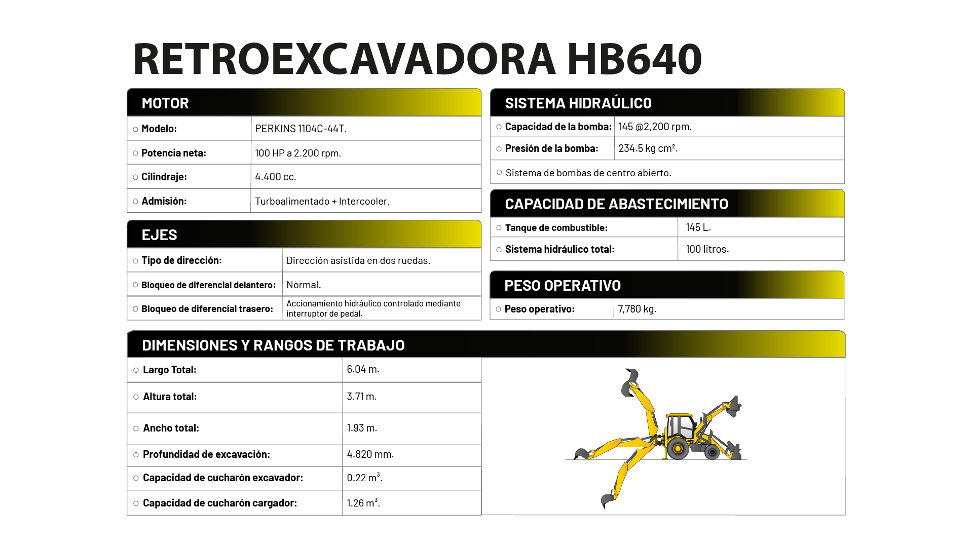Versatilidad, potencia y control para todo tipo de terreno. La HB640 está equipada con un motor Perkins 1104C-44T turboalimentado con intercooler, capaz de generar 100 HP a 2.200 rpm. Ofrece una excelente profundidad de excavación de 4.820 mm y capacidad de cucharón excavador de 0.22 m³, ideal para trabajos de precisión. Además, su cucharón cargador de 1.26 m³ mejora el rendimiento en carga y movimiento de materiales. Su sistema hidráulico de centro abierto y dirección asistida en dos ruedas garantiza operaciones suaves y seguras. Un equipo robusto, confiable y eficiente.
