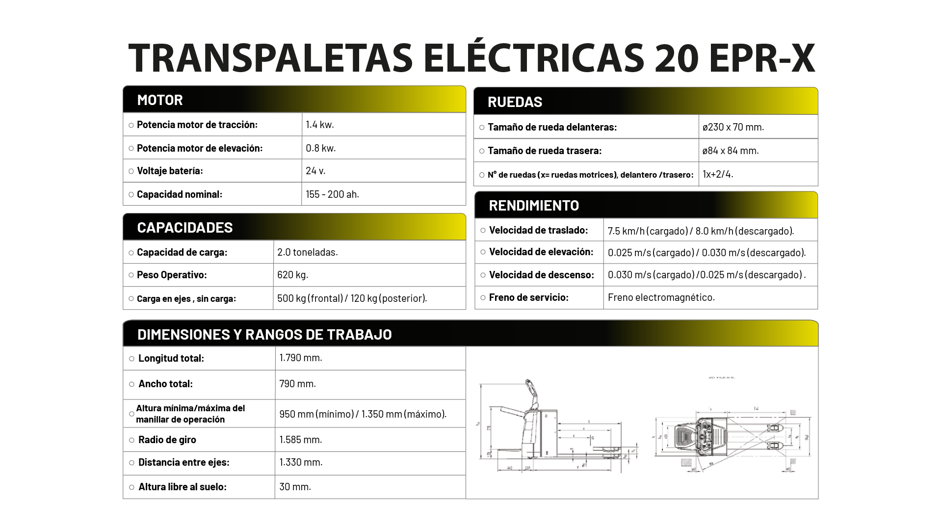 Compacta, eficiente y diseñada para el trabajo ágil en almacenes. Esta transpaleta eléctrica soporta hasta 2 toneladas con un peso operativo de apenas 620 kg. Su motor de tracción de 1.4 kW, combinado con una batería de 24 V, permite desplazamientos suaves a 7.5 km/h con carga y 8 km/h sin ella. Ideal para operaciones de corta y media distancia, ofrece estabilidad con freno electromagnético y excelente maniobrabilidad gracias a su radio de giro de solo 1.585 mm.